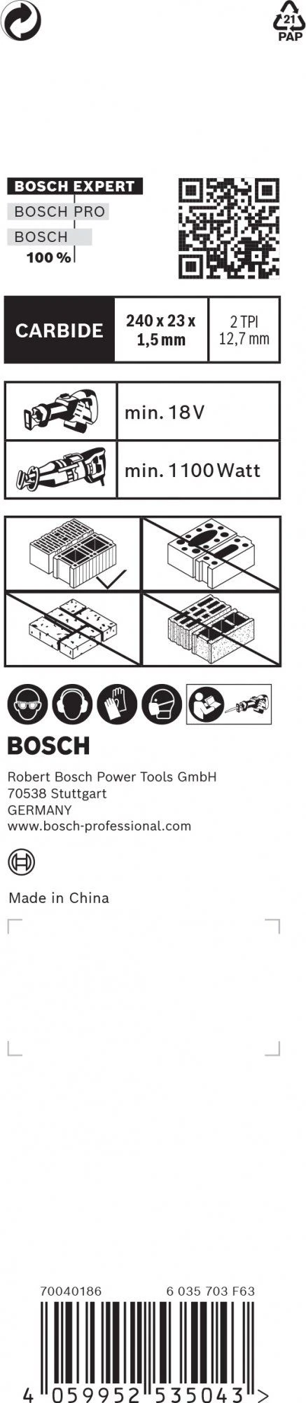 Voor de taken die conventionele bi-metalen reciprozaagbladen niet aankunnen, gebruikt het Bosch Expert ‘Hollow Brick’ reciprozaagblad Bosch Carbide Technology en is het speciaal ontworpen voor het zagen van holle bakstenen. Het brede lichaam en de dikke materiaal zorgen voor stabiliteit voor professionals om een nauwkeurige zaagsnede te maken. De gesoldeerde hardmetalen tanden zijn daarbij sterk genoeg om de hele dag bakstenen te zagen.