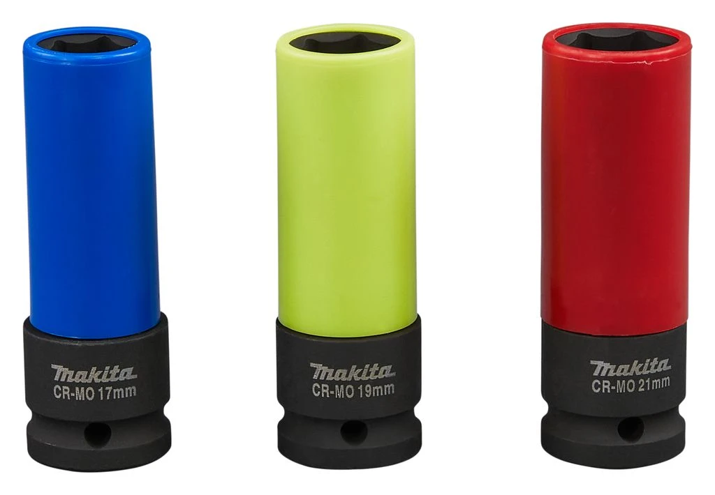 3-delige Makita krachtdoppenset in handig etui. Deze set bestaat uit de afmetingen 17 – 19 – 21mm met 1/2″ VK aansluiting. De doppen zijn 86mm lang waardoor ze bij uitstek geschikt zijn om wielbouten aan te draaien. De kunststof huls om de dop voorkomt beschadiging van het wiel.